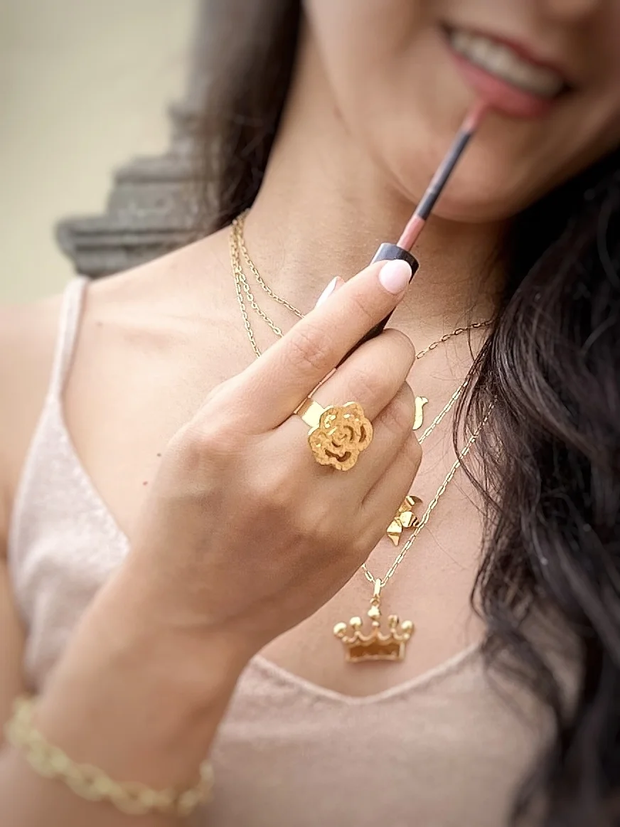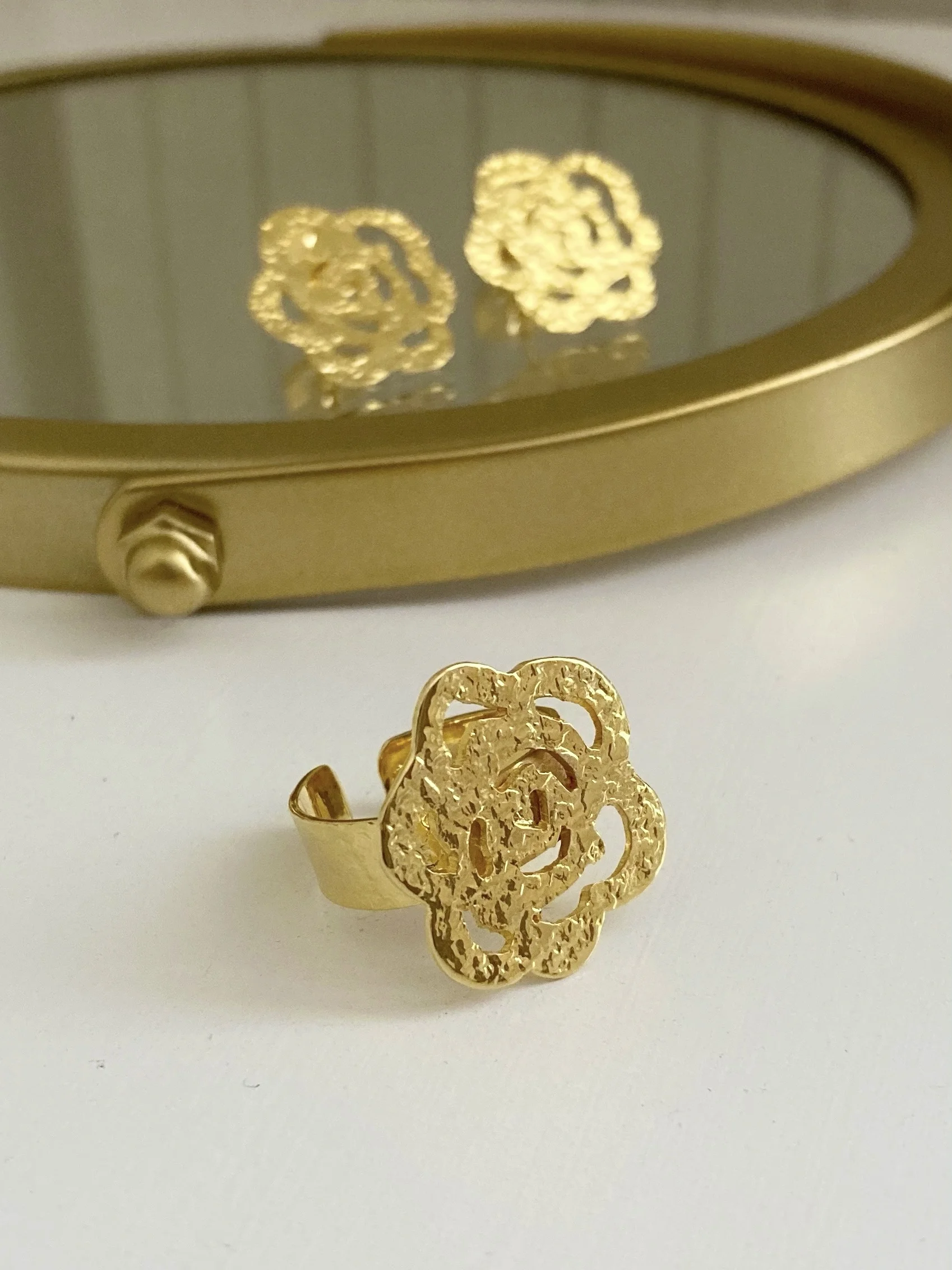 • Anillo rosa martillada plana en bronce con baño en oro de 24 kilates