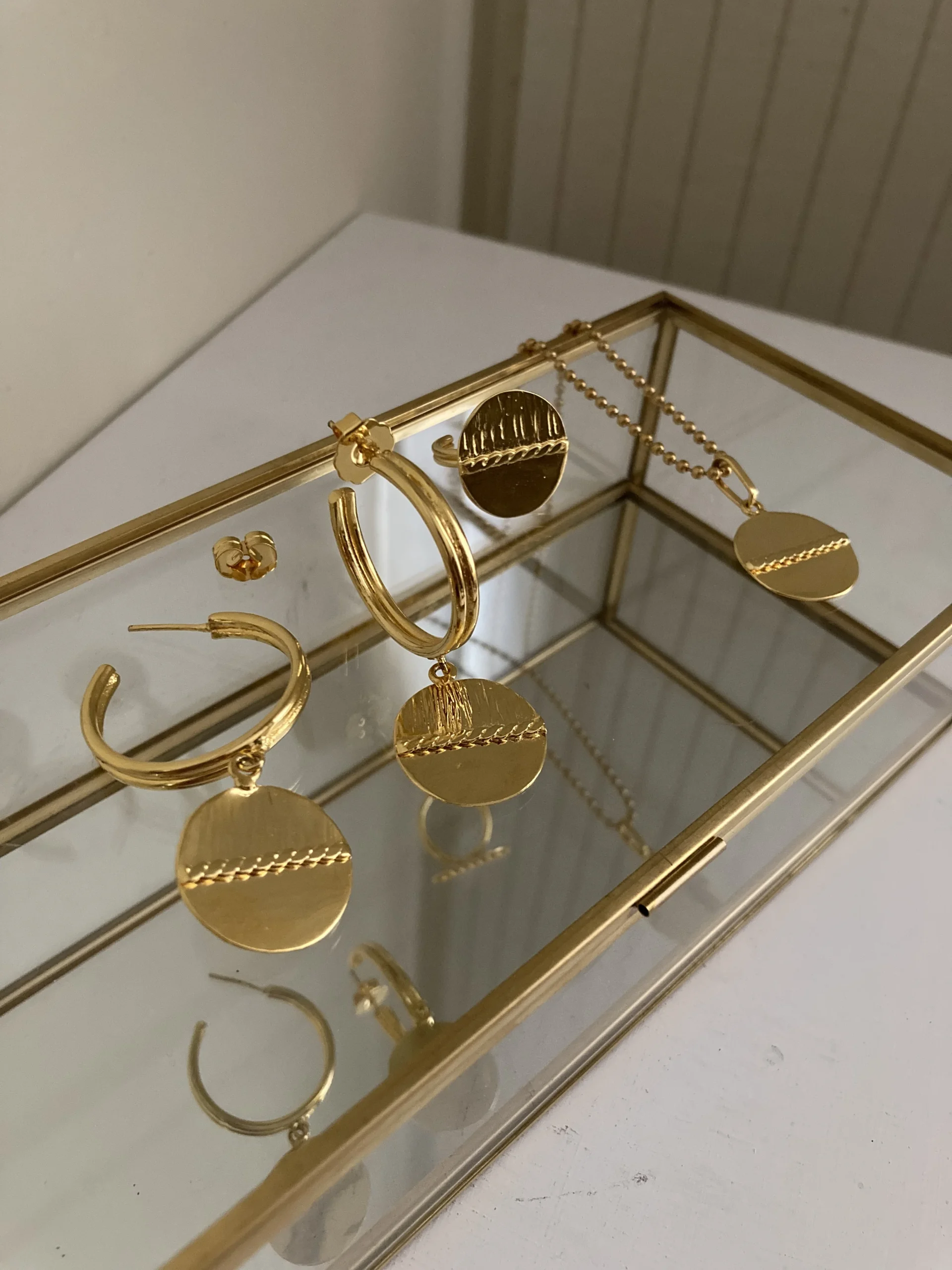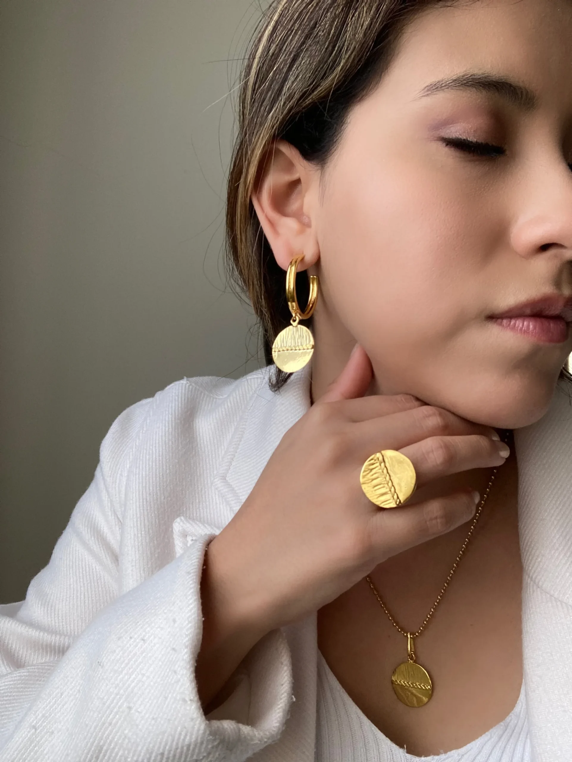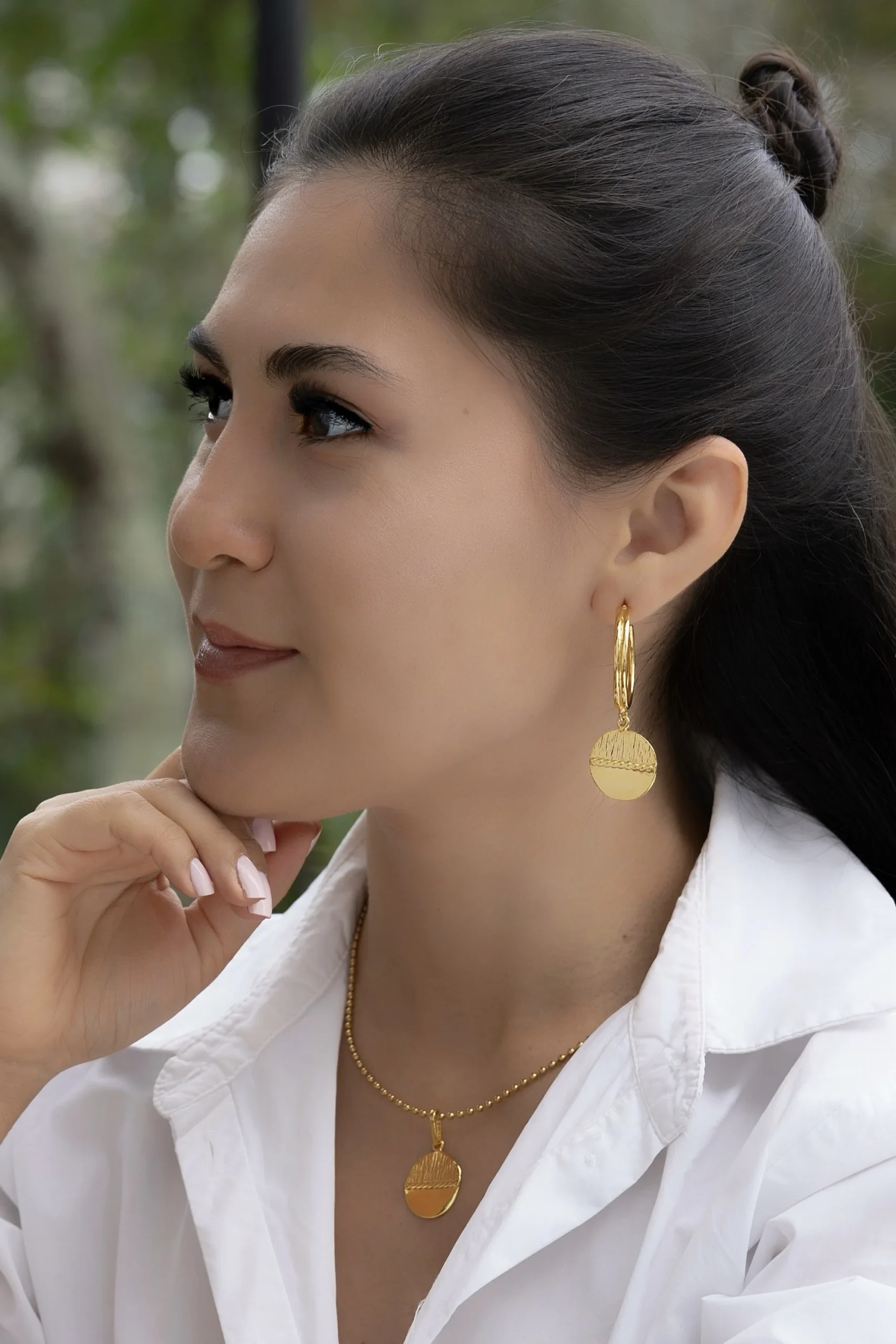 • Candongas doble tubo con dijes planos texturizados en bronce con baño en oro de 24 kilates